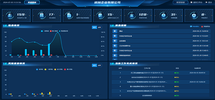 構(gòu)建可視化數(shù)據(jù)中心看板集成匯總企業(yè)安全生產(chǎn)運行數(shù)據(jù),涵蓋隱患情況、風險巡查情況、工作完成情況、預(yù)警預(yù)告情況、到期提醒、物聯(lián)報警等,便于負責人全盤掌握企業(yè)安全管理動態(tài)。